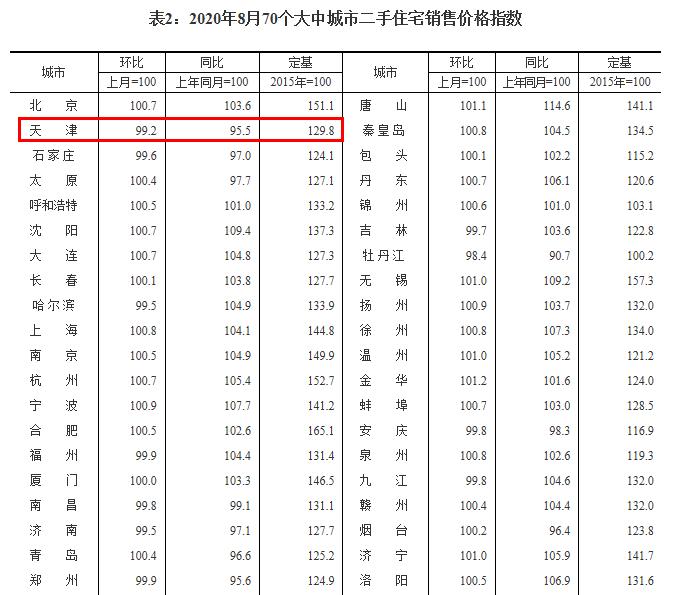另外,国家统计局近日刚刚发布的2020年8月份70个大中城市二手住宅销售价格指数,天津环比下跌0.8%,同比去年8月份下跌4.5%。