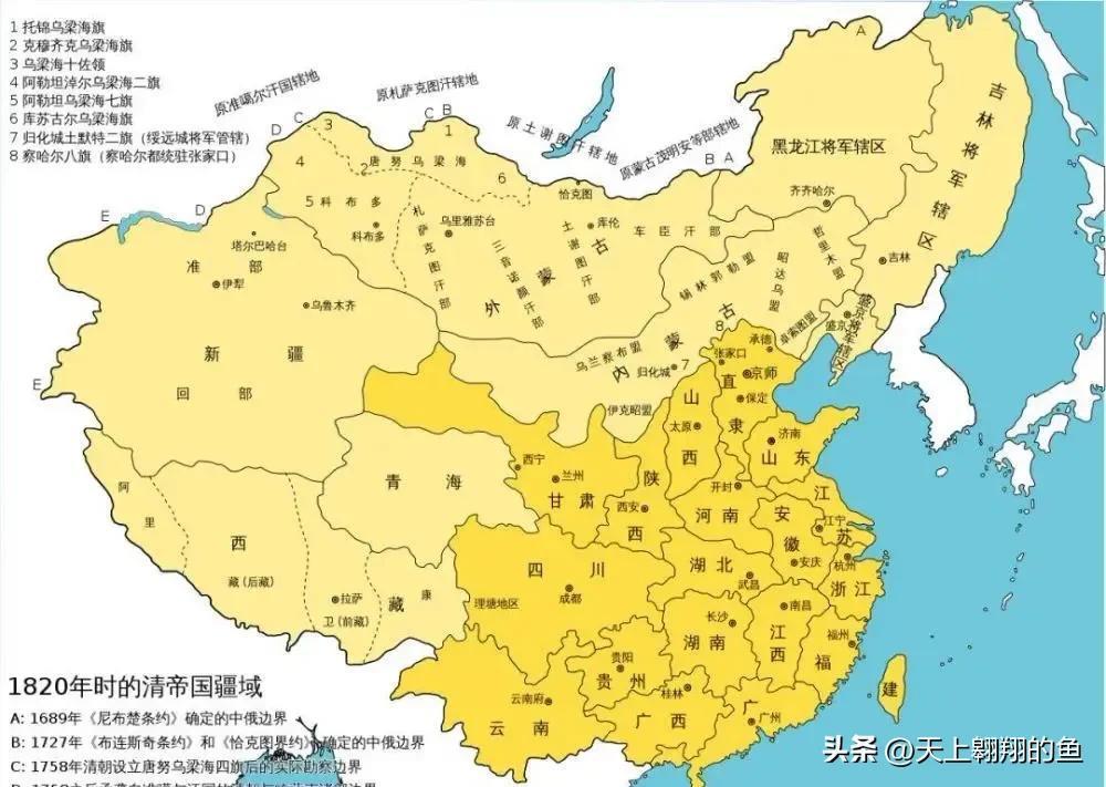 全盛时期,清朝陆地面积1300多万平方公里,在全国设置了18个省,盛京、吉林、黑龙江、伊犁、乌里雅苏台5个将军辖区,以及驻藏大臣、西宁办事大臣和蒙古的盟旗。清王朝中央政府直接控制的版图,超越了历史上的任何一个王朝,也比现在的国土面积还要大。