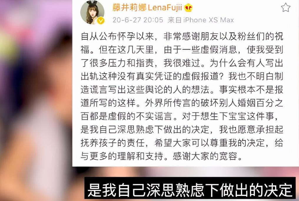 对此,藤井莉娜不得不公开澄清,一方面藤井莉娜称自己选择做单亲妈妈完全是自己深思熟虑的结果,而外界传说自己插足破坏别人家庭所以才没有跟男方结婚的事,是子虚乌有的。另一方面,她还表示自己今后会对孩子负责,希望大家尊重自己的决定,也可以继续一如既往地支持自己。