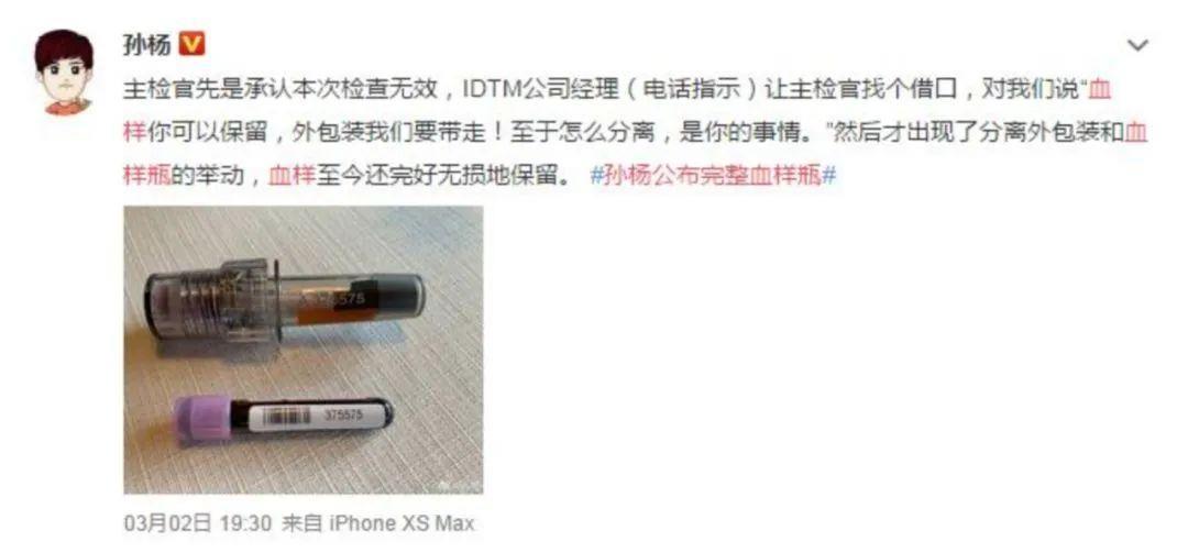 3月2日晚上,孙杨发布了血样瓶,声称血样完好无损,可是我们看到B瓶血样并没有外包装,封套被打破血后,血样也就失效了。