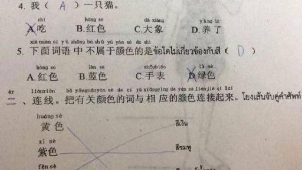 看到下面的这张泰国同学做的中文试卷,显然答的很不容乐观。试卷相对来说还是是比较简单的,也许是作为学生学了很多颜色的词语,搞混了吧!而且还有一个爱好“吃猫”。