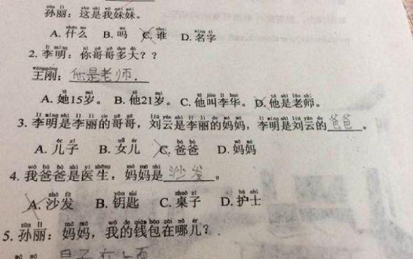 贴心的中文试卷每一个汉字都标注了拼音,但是即使是这样,这个同学的答案也是极其的惨不忍睹。我的爸爸是医生,妈妈是“沙发”,这样巧妙的答案,四道题全军覆没。