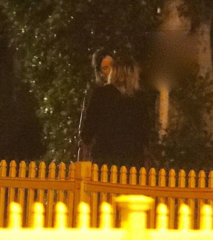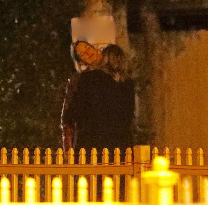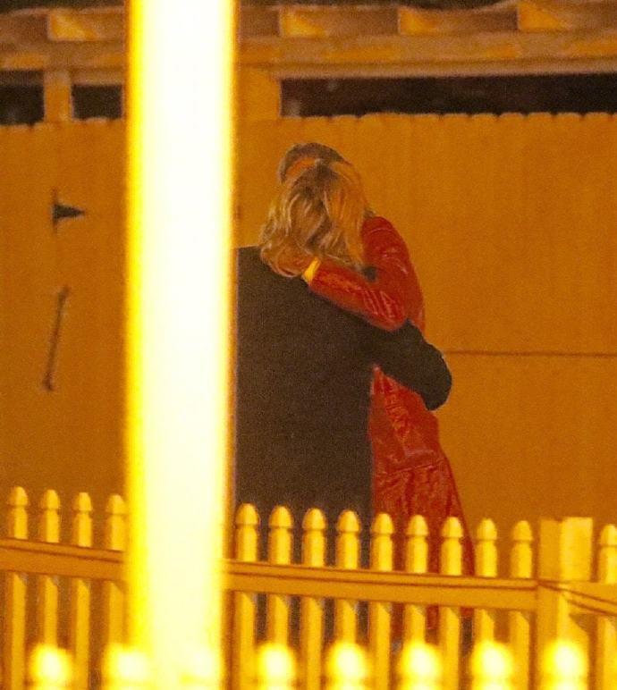 科洛·莫瑞兹一身黑色造型,黑大衣黑裤子黑皮靴,而模特Kate Harrison则是身穿红色长款外套搭配牛仔裤,休闲时尚。两人并排走着,有说有笑,走至街头时还相拥亲吻了起来。