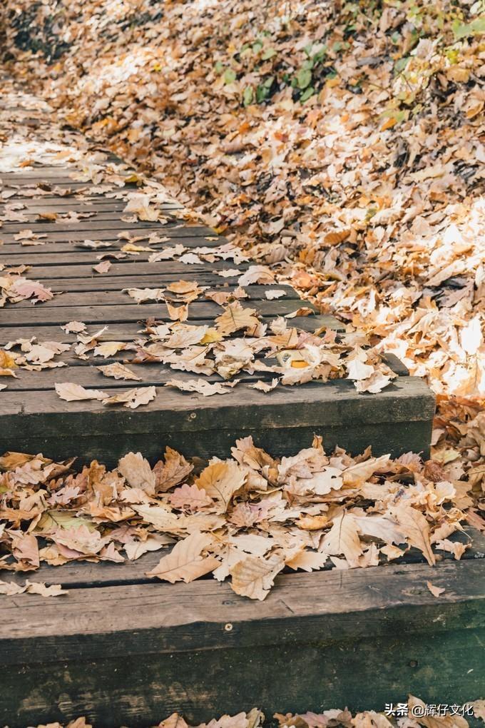这条山路是木栈道,很好走。在栈道上全是落叶,踩在上面一块“水泥板”,很治愈。