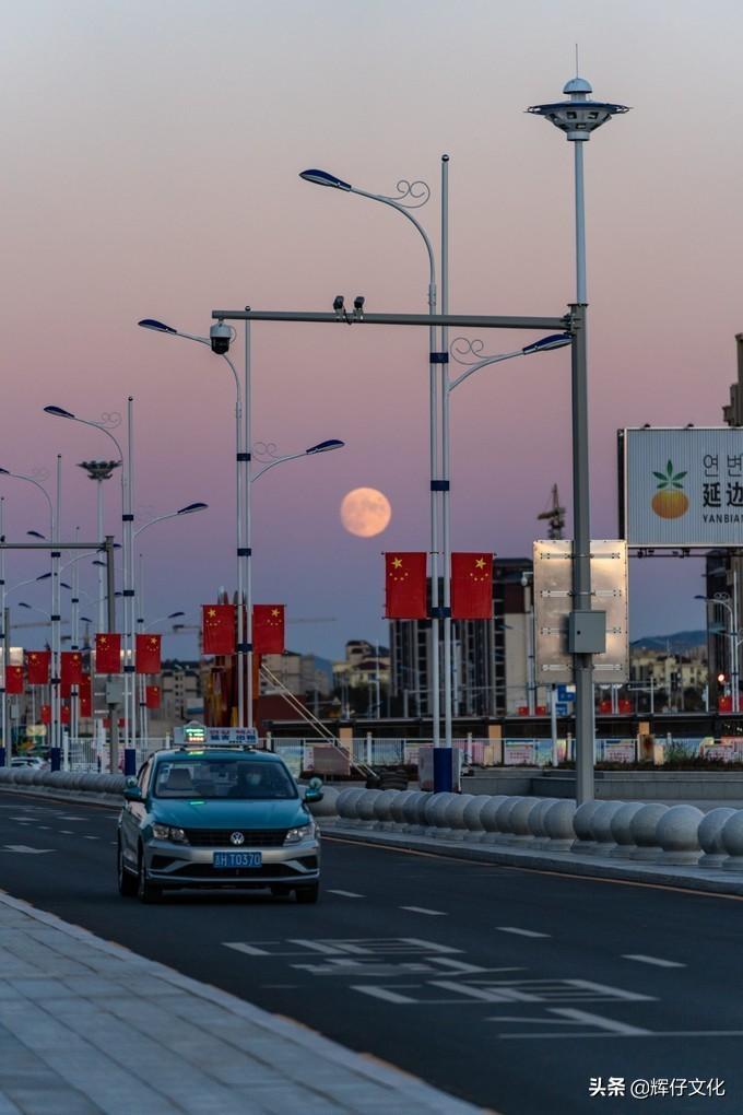 到了延吉西站,出来就是漫天的晚霞,还有一轮粉红的月亮,瞬间将赶路的疲惫一扫而光。