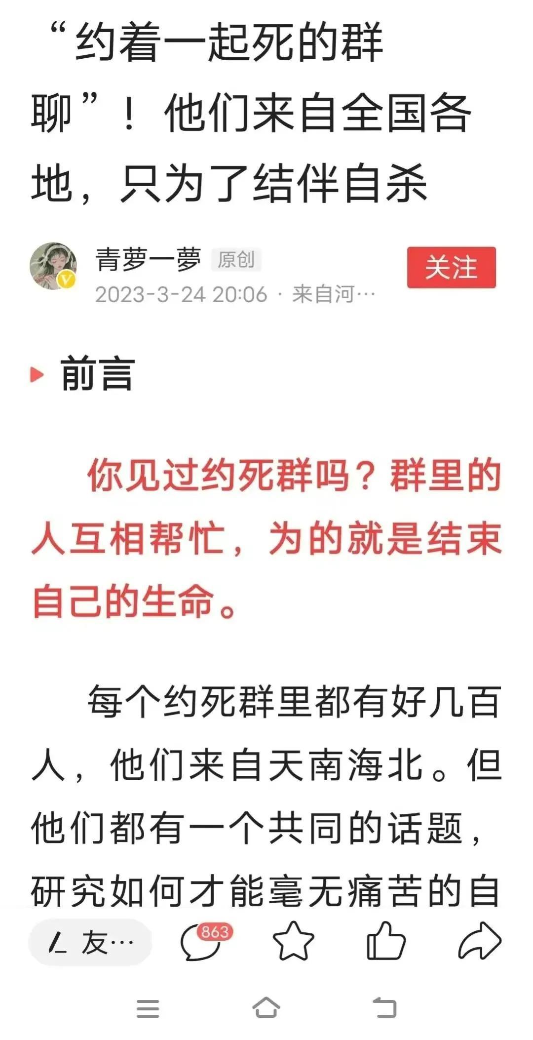 最近,在一篇文章中提到有一种“约着一起死的群聊”,他们来自全国各地,只为结伴自杀。
