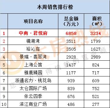本周共2个项目取得预售证,为中南·君悦府以及联合大厦,新增面积为79416平方米,新增房源441套。
