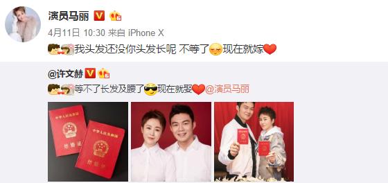 4月11日,马丽在朋友圈晒出结婚证照片,随后男方许文赫也在微博上正式公布两人领证结婚:“等不了长发及腰了,现在就娶!”