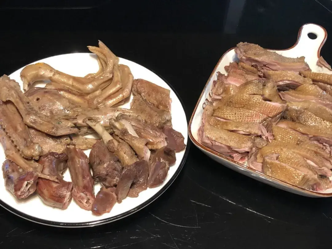 ▼ 满满两大盘鸭肉。 咸水鸭不仅是南京的特产,在福建漳州也特别有名,准确来说,是漳州的平和县南胜镇,大家上网一搜“南胜咸水鸭”就能了解到更多的信息。能被称为地方特色的美食,肯定有独到之处,我做的这种家常版本的咸水鸭,在流程上没那么复杂,但美味丝毫不减分,起码跟我吃过的南京咸水鸭味道比较接近了。