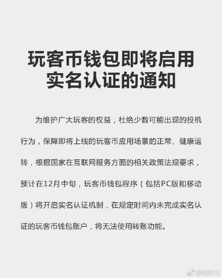 11月22日,迅雷玩客云团队发布公告,称根据法规要求,预计在12月中旬,玩客币钱包程序将开启实名认证机制,届时未完成实名认证的玩客币钱包账户,将无法使用转账功能。
