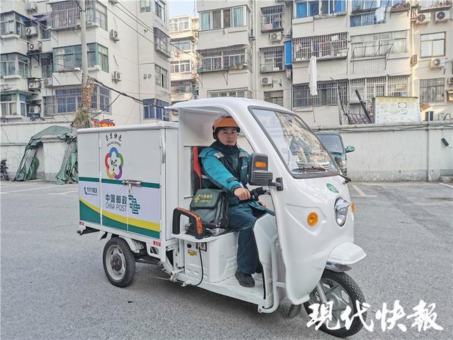 12月5日,现代快报记者在南京邮政龙蟠营投部看到,这里的部分揽投员已经用上了新的快递三轮车。揽投员蔡师傅的车周身白色,前面是一个驾驶位,后面一个大箱体,箱体上印有“南京快递”LOGO以及中国邮政的标识。