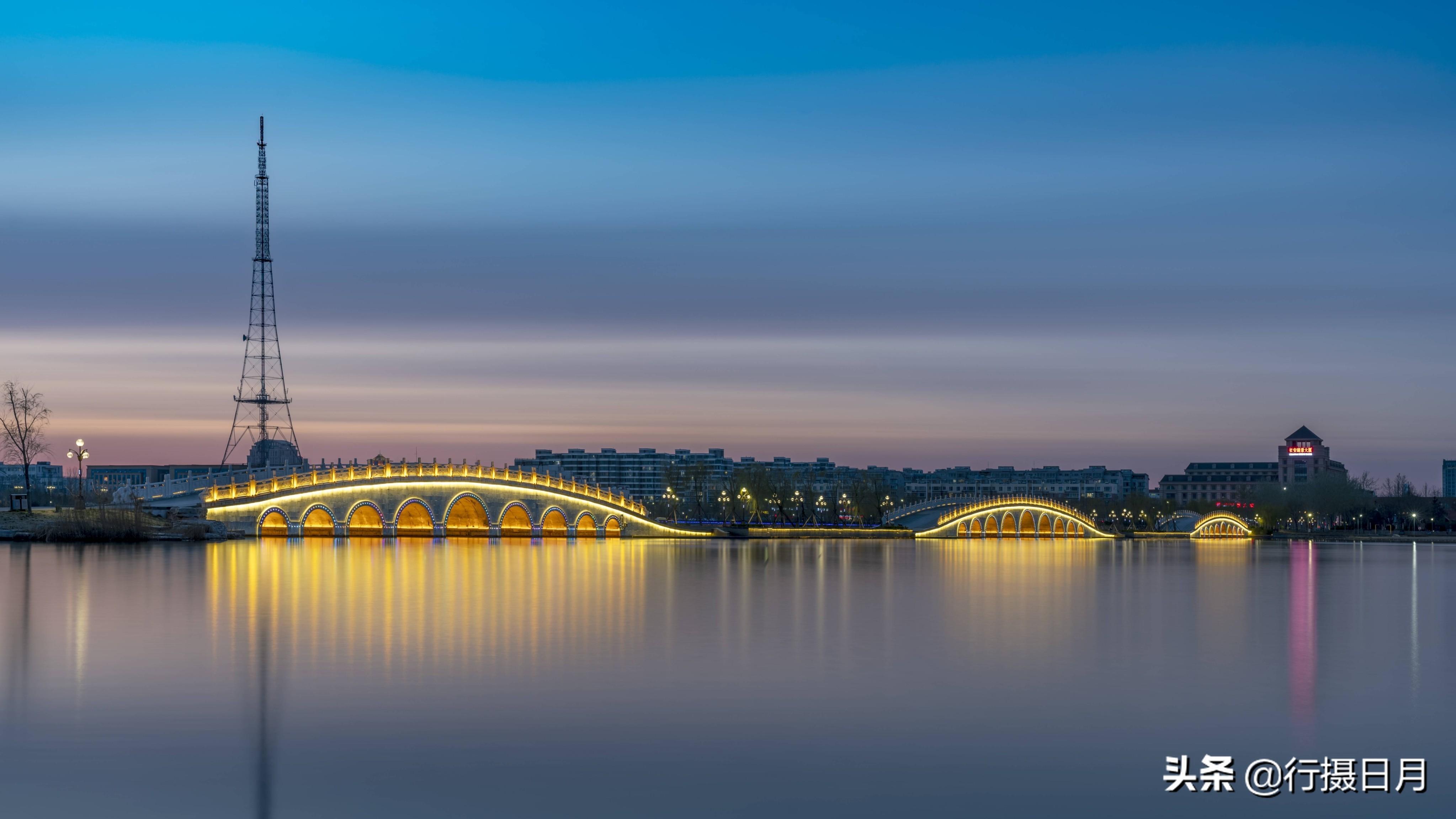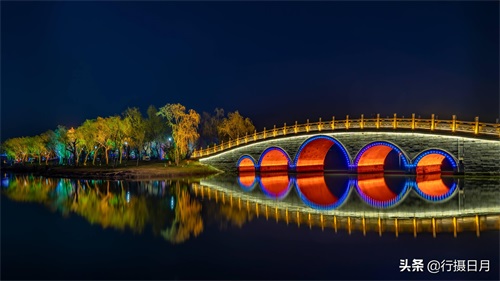 在灯光的勾勒下,一座座拱桥,显得晶莹而绚丽,原本相隔甚远的景物,在此刻都变得亲近了许多,灯、桥、塔、湖彼此映衬又相互竞秀。