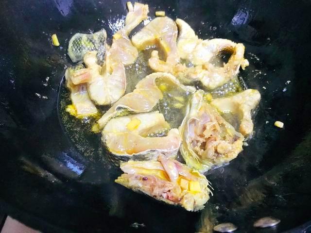 3,锅里放油烧热之后,把腌制入味的鱼块一一放到锅里,小火慢慢的煎至两面呈现出金黄色。注意翻面的时候小力一些,不要把鱼块翻碎了。