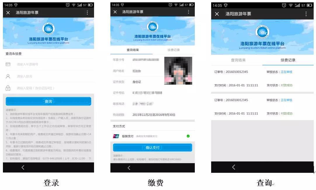 1、洛阳旅游年票在线平台支持年票用户在线查询和续费业务;