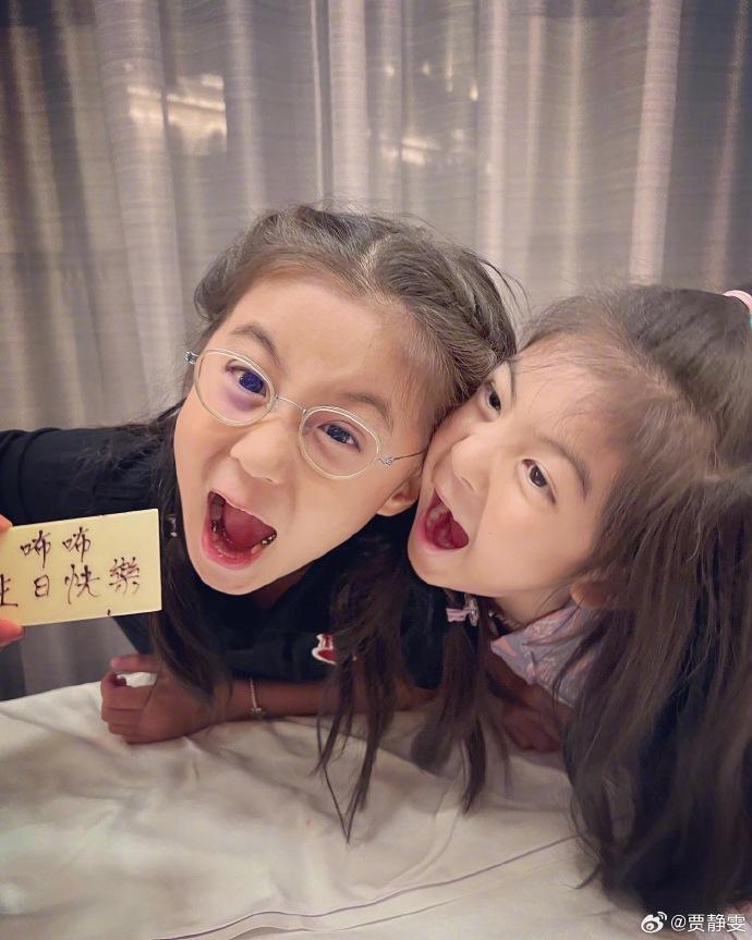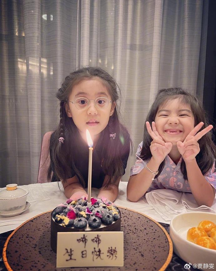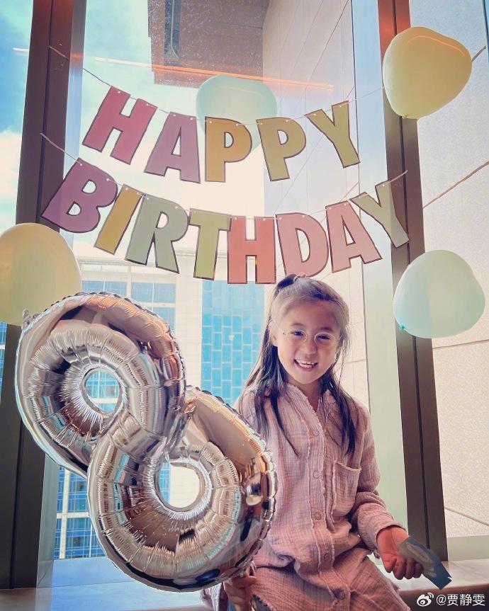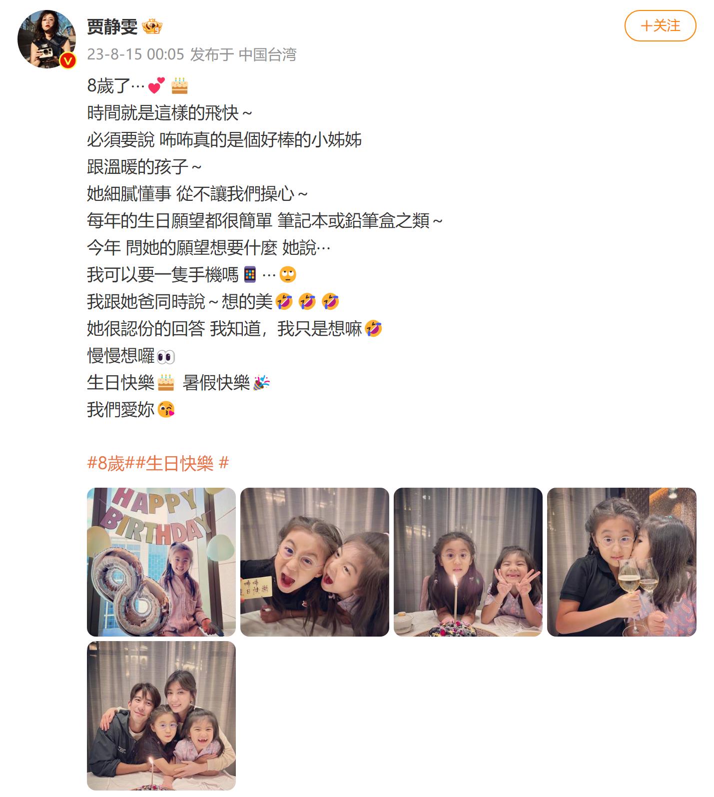 8月15日凌晨,演员贾静雯在微博发文晒照,庆祝女儿咘咘8岁生日: