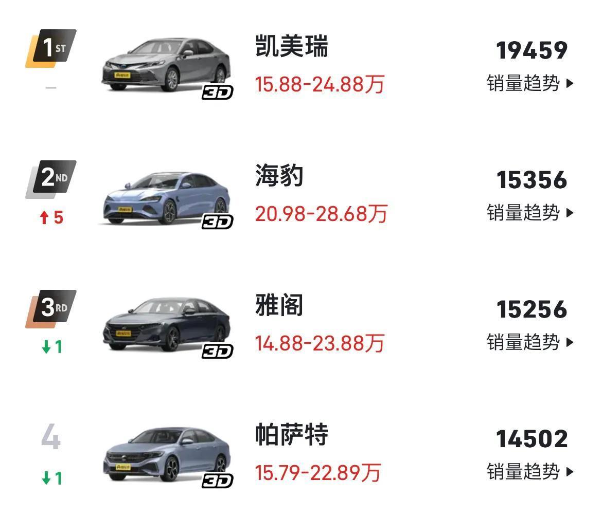 丰田凯美瑞销量夺冠,同比增长1.91%,家用车扛把子名不虚传
