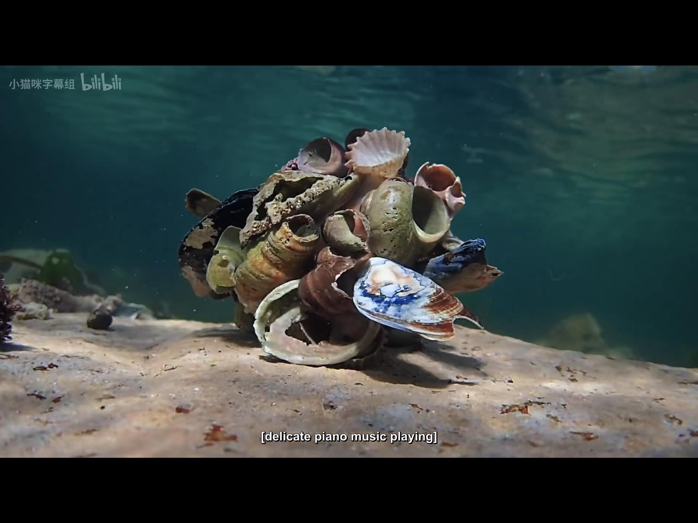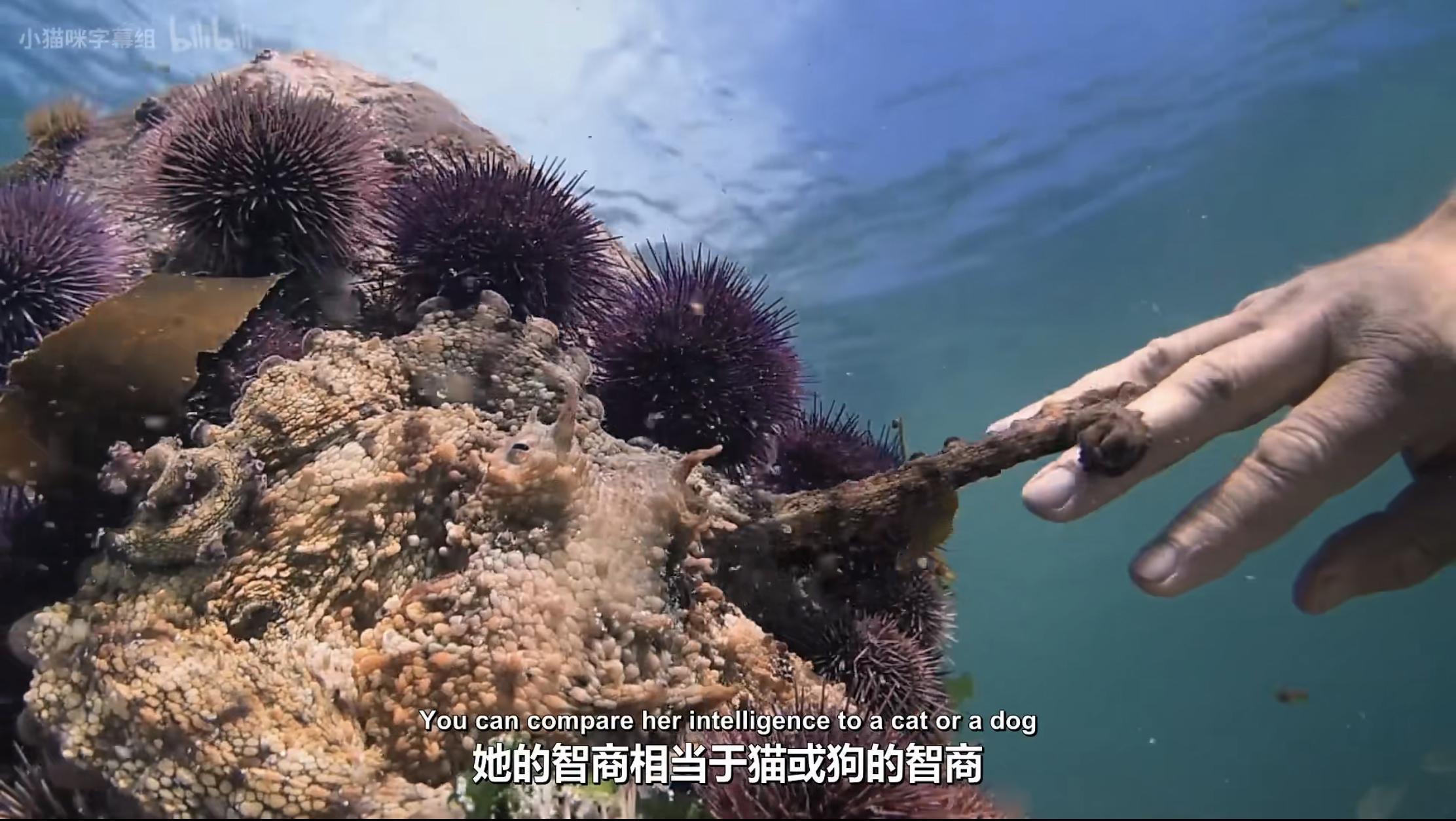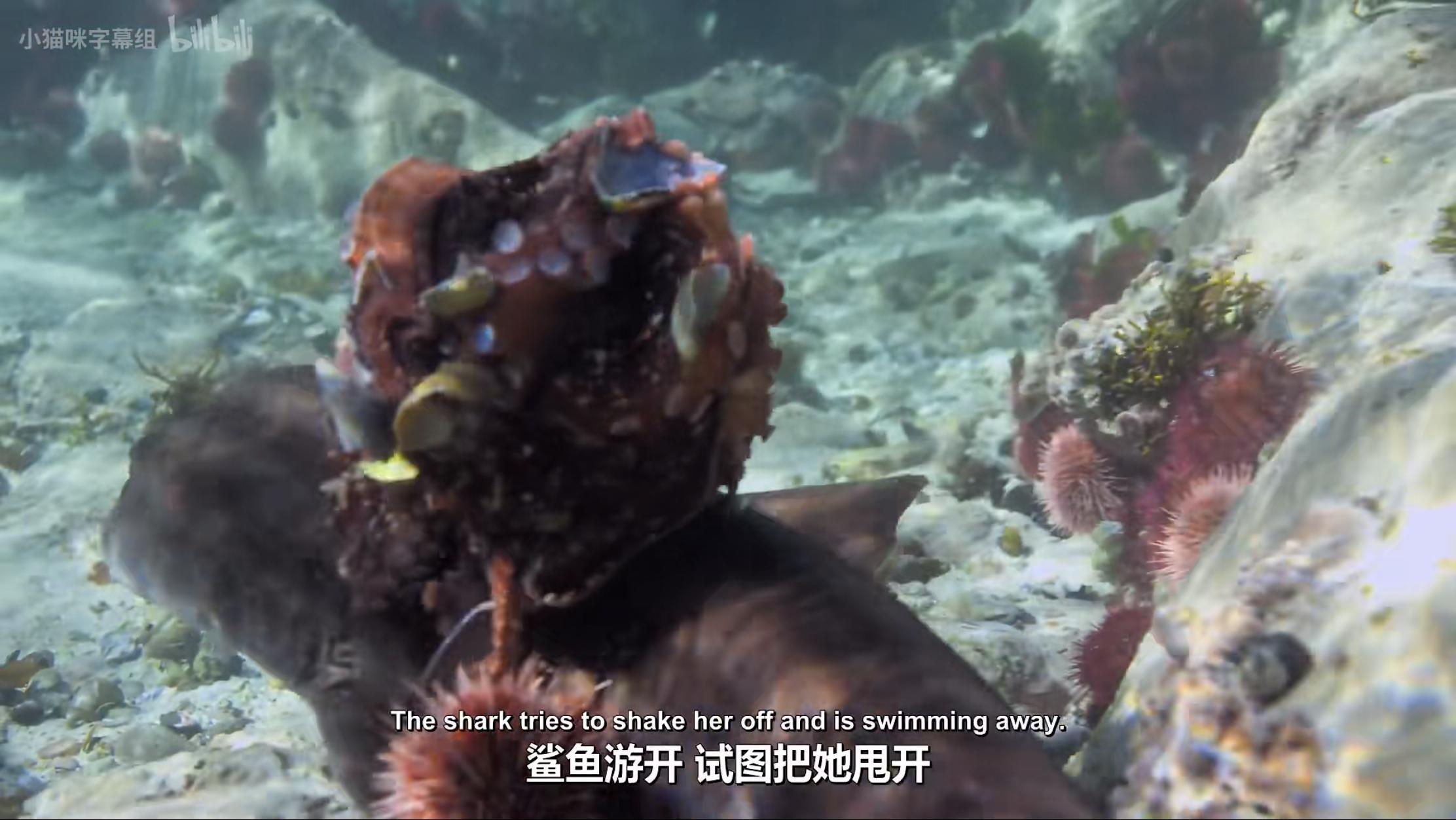 章鱼的智商可与猫狗相比,但生命只有一年多,有极强的模仿能力,可在不同情境下变色。满身贝壳是在被鲨鱼追捕时的自我防御措施(用触角吸住贝壳裹紧全身作为盾),优越的智商使它得以逃脱追捕。