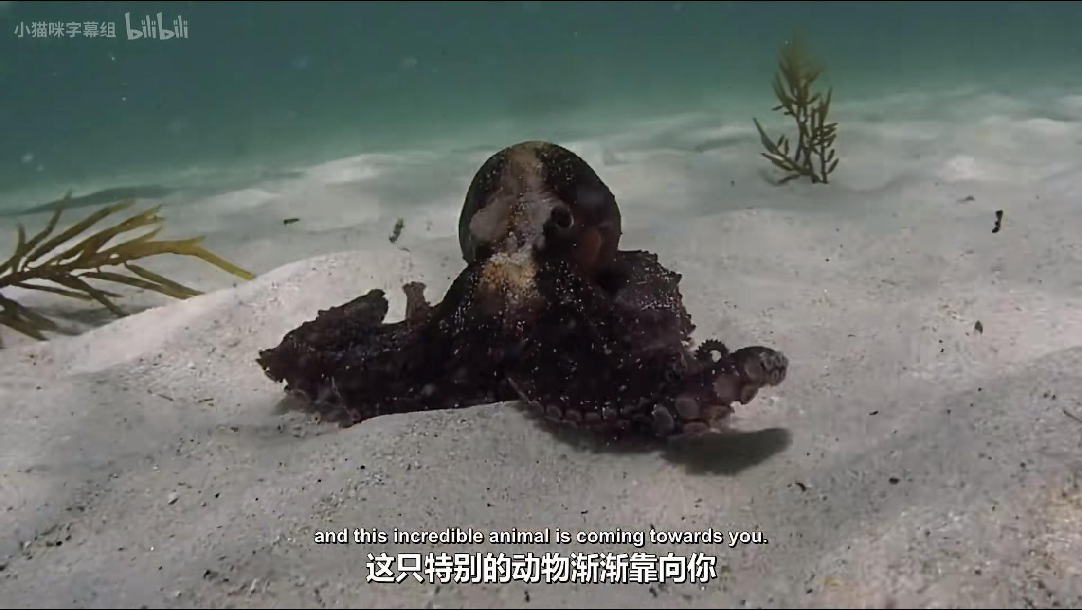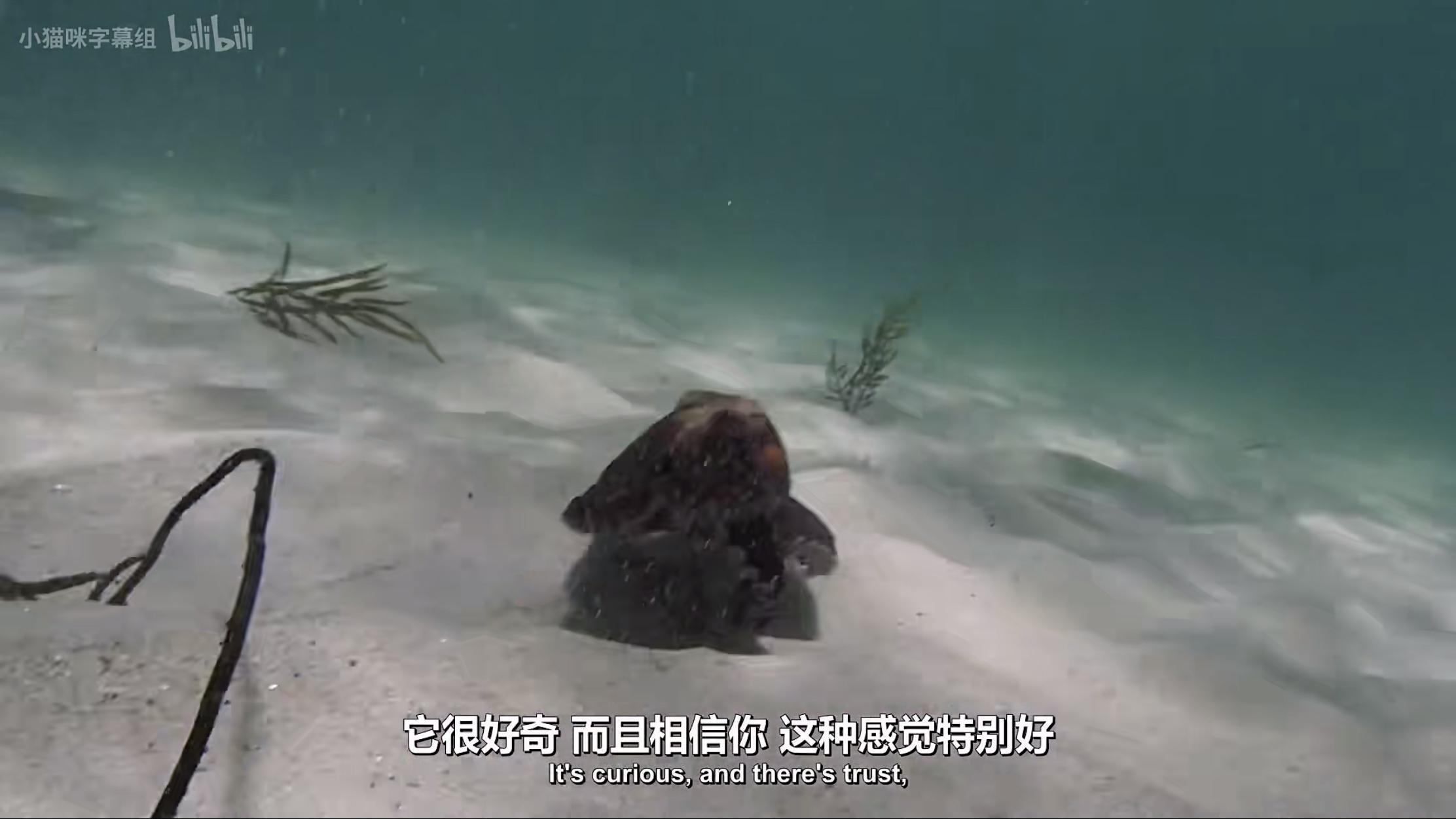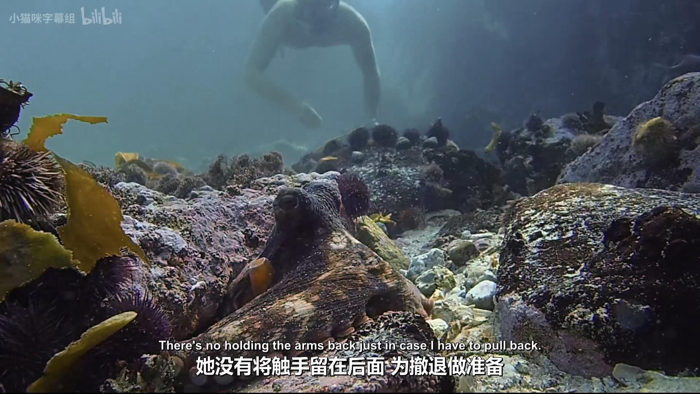 他回到儿时的大海,在海岸附近的海藻林潜水,偶遇一只满身贝壳的生物,是一只章鱼。