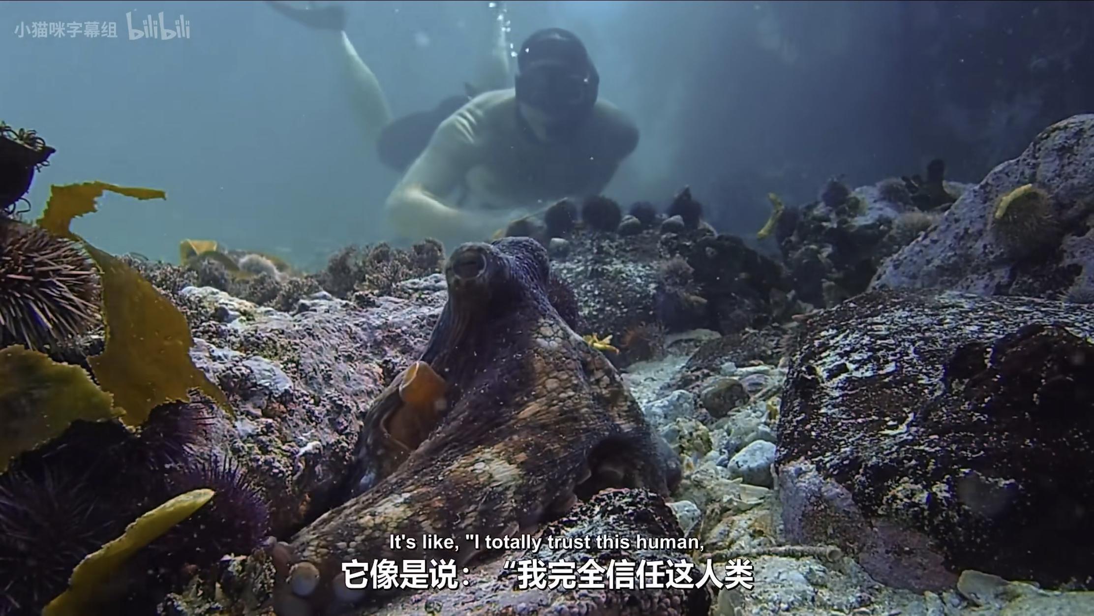 章鱼与克雷格的感情像小王子遇到他的玫瑰。他们“握手”过,一起在海底畅游过,也经历过信任危机而又解除危机。克雷格见证了这只章鱼的一生,在意识到自己即将不久于世时,章鱼“拥抱”了克雷格。
