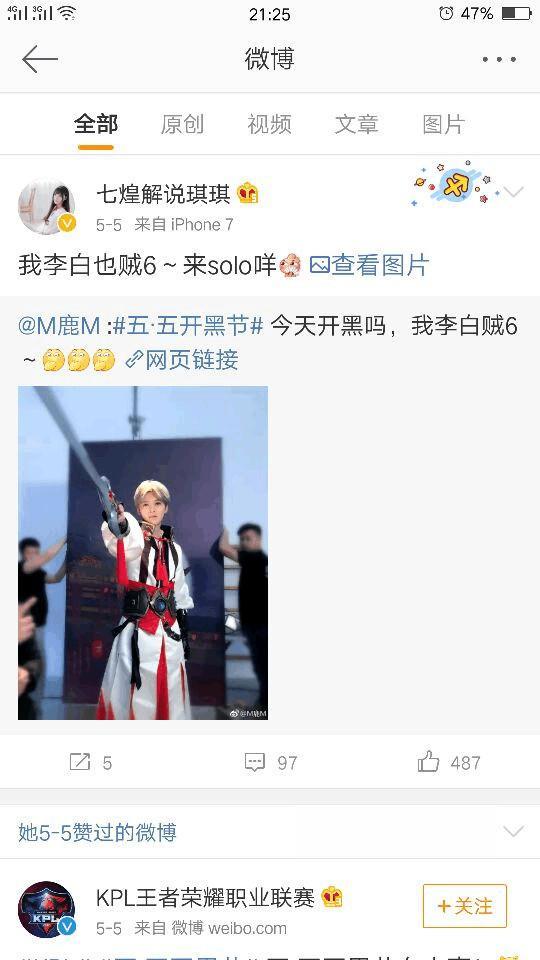 在五月五号的时候琪琪就转发并且@鹿晗说,我李白也贼6,来solo吗?如果单纯只是玩游戏的话,可以说10个鹿晗也未必玩的过琪琪,琪琪的王者水平是真的很高,上王者可以说轻轻松松。