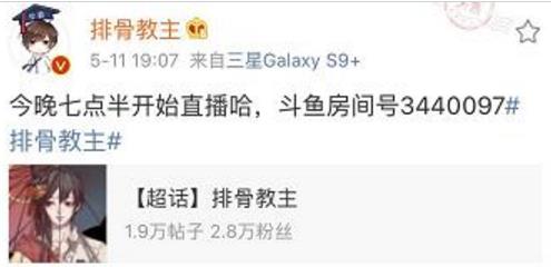 超人气歌手排骨教主在斗鱼直播平台首播,预定于8点整开播,但是在19:07时,排骨教主发微博表示,“今晚七点半开始直播哈,斗鱼房号340079”。