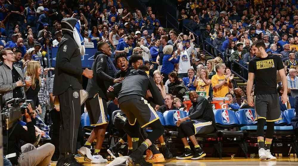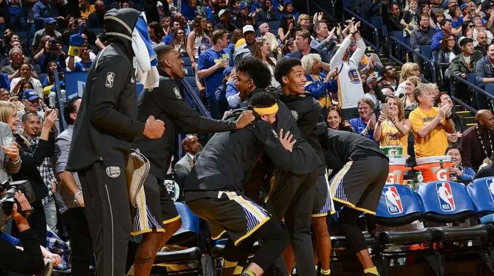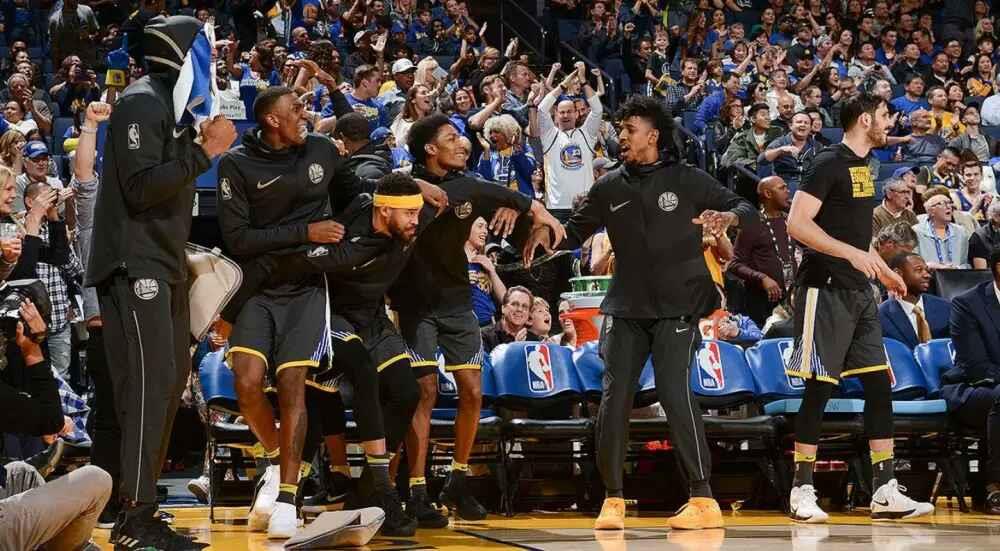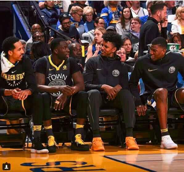 此外,本场比赛的最大亮点是属于克莱-汤普森的。他在第三节比赛中,克莱在快速反击中接到库里的传球,完成单手滑翔劈扣,整个甲骨文球馆沸腾了!替补席的反应更是笑逗了!勇士官方也在推特上发布了一组替补席上的球员当时反应的照片。