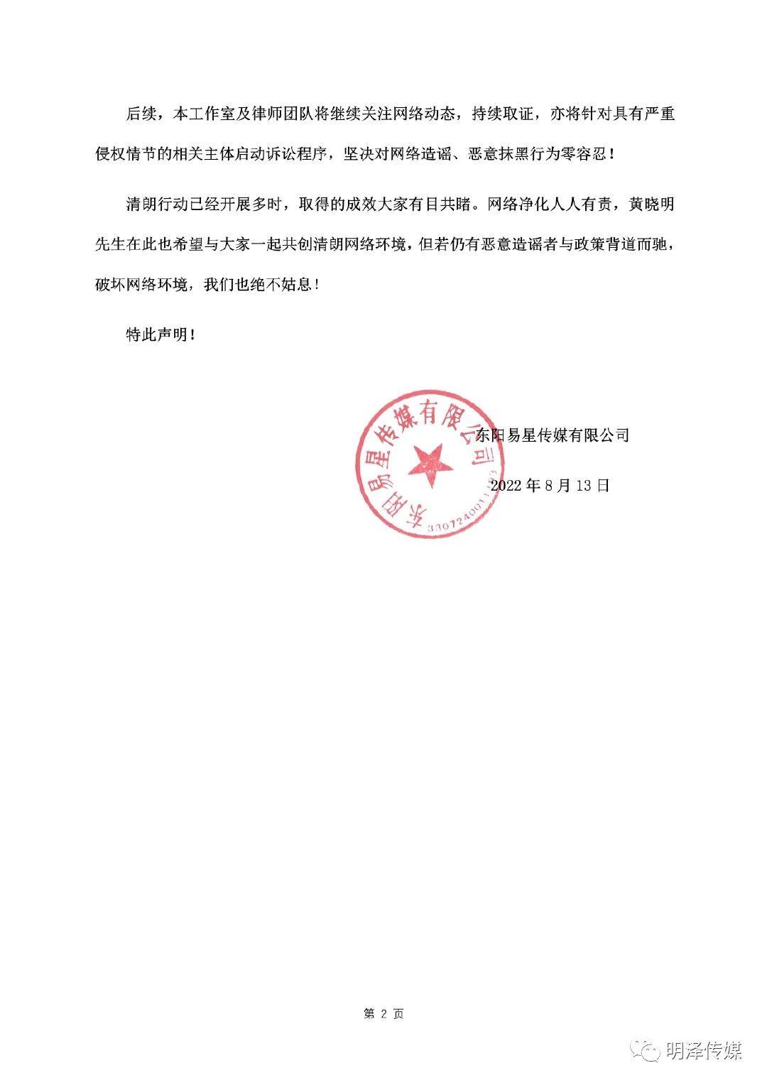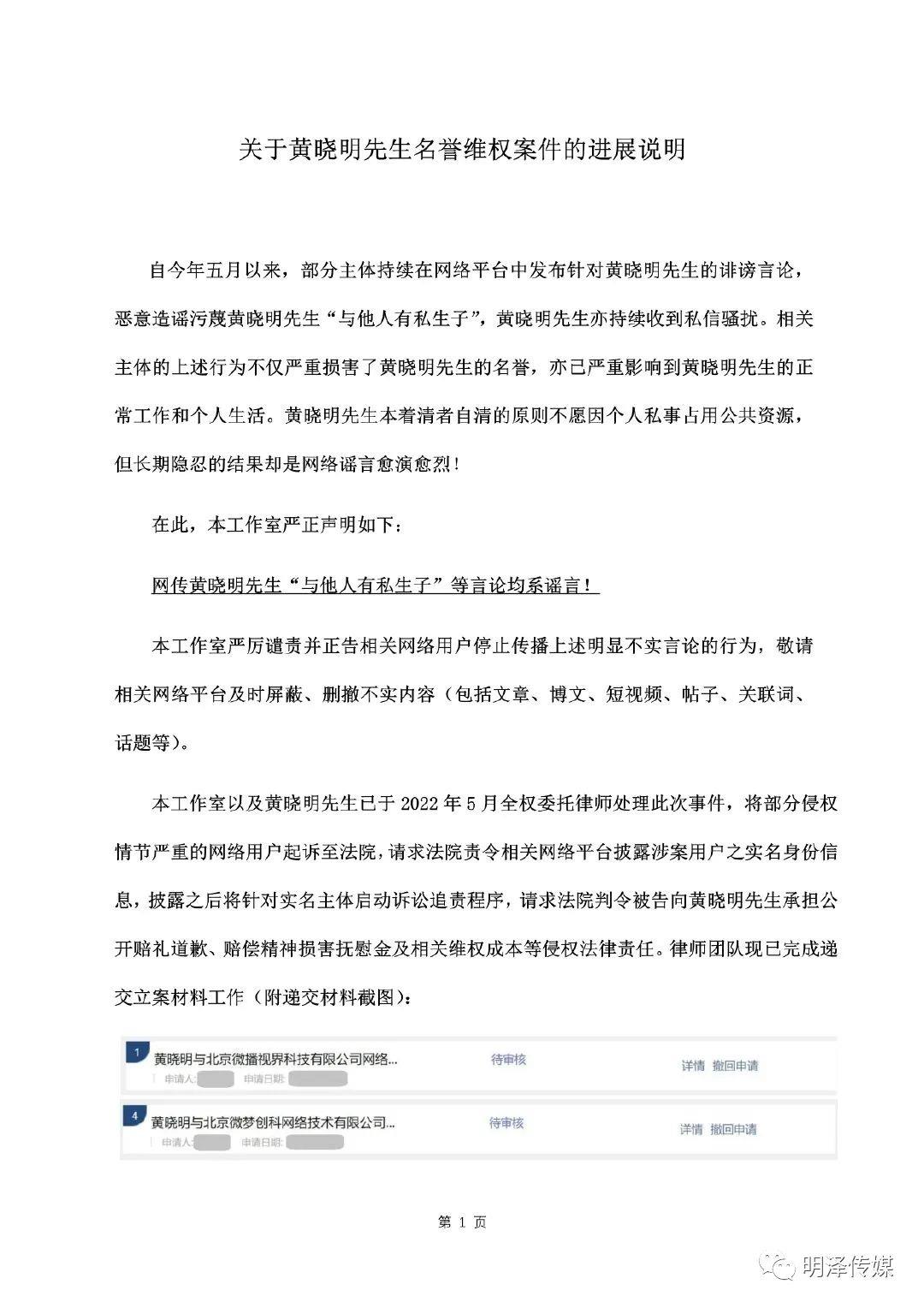 2022年8月13日,黄晓明工作室 发布声明:网传黄晓明先生与他人有私生子等言论均系谣言。委托律师也公开黄晓明名誉维权案件的进展,目前已完成递交材料立案工作。黄晓明 也转发回应表示:”想叫我爸的人,欢迎拿出证据!”