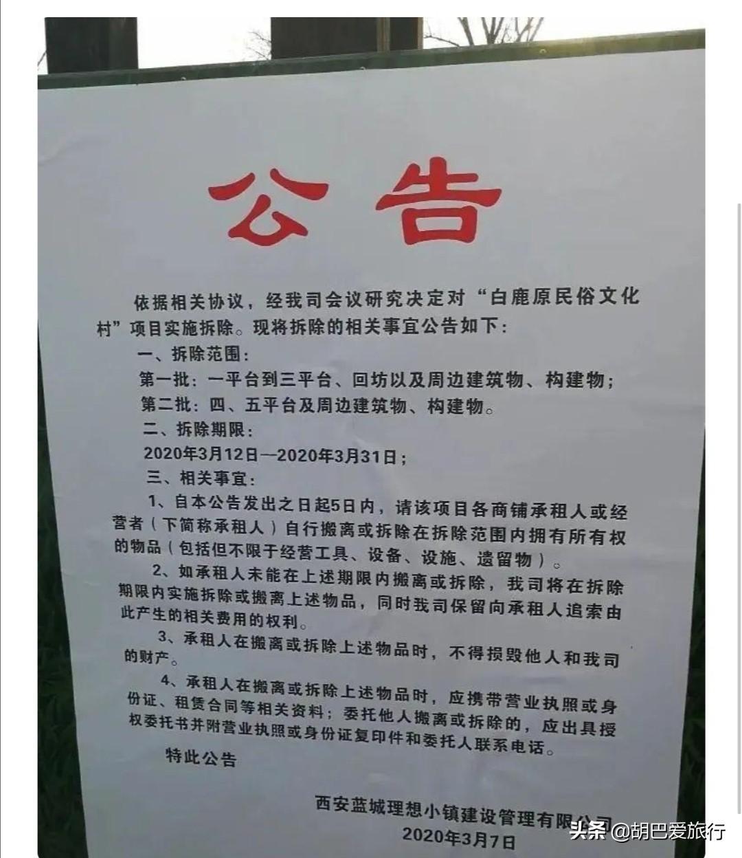 2020年3月7日,西安蓝城理想小镇建设管理有限公司的一张公告,即将让曾经“人满为患”的白鹿原民俗村彻底远离人们的视野了。公告明确了民俗村的拆除范围和拆除期限,自3月12日至3月31日,也许一月之后这个投资3.5亿人民币运营4年的关中民俗村就不复存在了,真是沉舟侧畔千帆过、病树前头万木春哪。