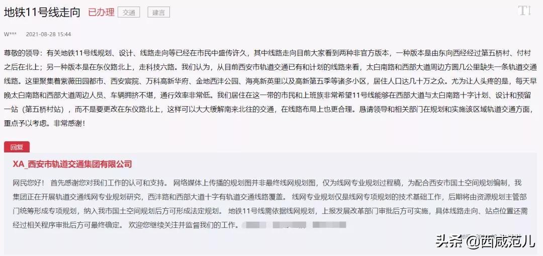 问:尊敬的领导:有关地铁11号线规划、设计、线路走向等已经在市民中盛传许久,其中线路走向目前大家看到两种非官方版本,一种版本是由东向西经经过第五桥村、付村之后在北上;另一种版本是在东仪路北上,走科技六路。