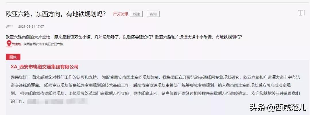 答:为配合西安市国土空间规划编制,正在开展轨道交通线网专业规划研究,欧亚六路和广运潭大道十字有轨道交通线路覆盖。