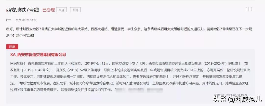 问:原计划西安地铁7号线在大学城附近有邮电大学站、西部大道站,附近居民,学生众多,这条线建成后可大大缓解附近的交通压力。请问地铁7号线是否在下一步规划中?是否可实施?