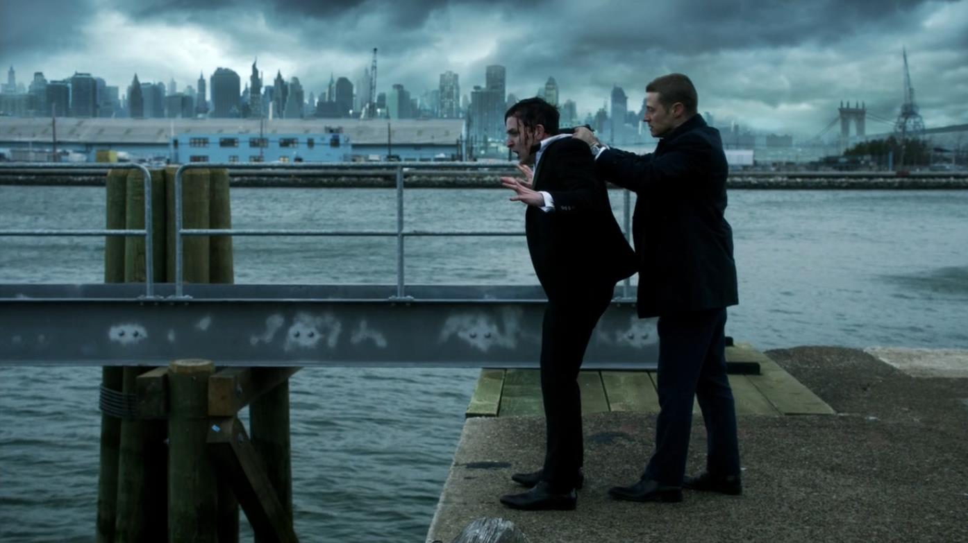 面对这种其实很好选择的选择,企鹅只能被牺牲掉,他拉着企鹅来头码头,企鹅哭着求他不要杀他,说战争要来临了阿法要失势了,他有这方面的才能,如果愿意放他一马,他愿意做牛做马为戈登卖命。戈登其实根本就不想杀企鹅,他偷偷告诉企鹅别回哥谭了,开了一枪假枪,放跑了企鹅。