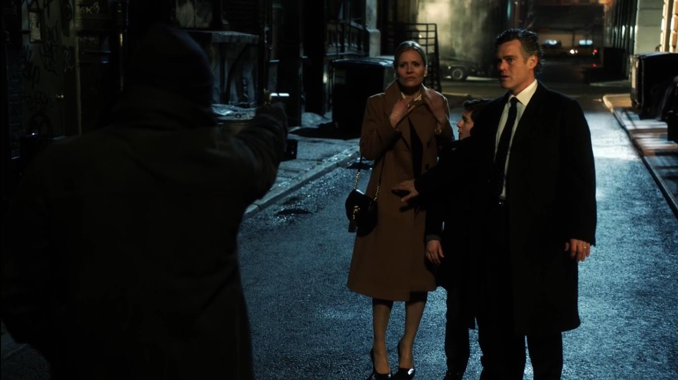 故事的一开始,现在的哥谭市已经暗潮汹涌各路势力都虎视眈眈鱼龙混杂,首先被开刀的就是布鲁斯·韦恩的父母托马斯和玛莎·韦恩。熟悉漫威的朋友都知道啊蝙蝠侠就是眼前的这个小男孩韦恩,这天小韦恩和父母看完电影回家走在一条漆黑的巷子里,有个劫匪突然拿着枪出现,劫匪让韦恩父母把所有钱财叫出来,以及韦恩母亲脖子上带的珍珠项链也不放过。