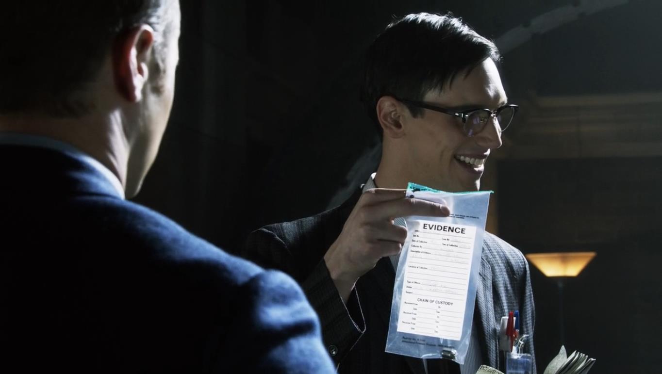 很快他们在大高个家里找到了那串项链,确认了是大高个杀害了韦恩夫妇,已经被杀死归案了。这件事上了新闻大家都很开心,说实话我觉得有些仓促,这么多项链怎么就能确认是韦恩夫人的那一条验了指纹了吗?而且大高个死了也死无对证,根本没有审讯过,这不!菲什的手下企鹅赶紧偷偷地去告密,他告诉了重案组的蒙托亚和艾伦,说大高个是被菲什和警察陷害的。那串项链其实是菲什放进大高个的家里的,而这件事发生在布洛克和菲什见面过后,蒙托亚和艾伦幸灾乐祸,他们问企鹅为什么背叛菲什,企鹅谎称是因为韦恩那个可怜的孤儿唤醒了他的良知。