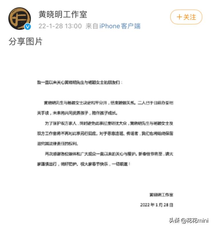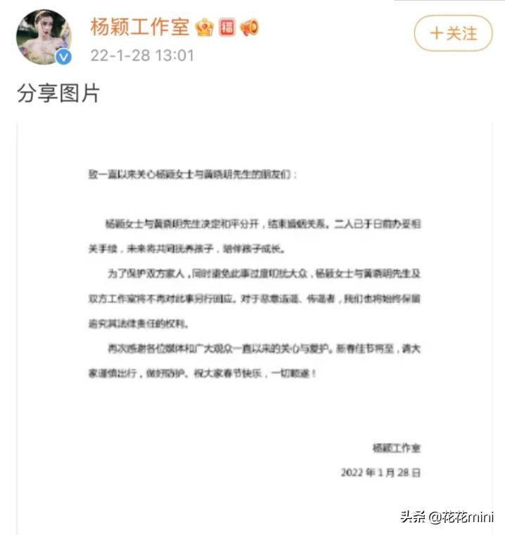 致一直以来关心黄晓明先生与杨颖女士的朋友们,黄晓明先生与杨颖女士决定和平分开,结束婚姻关系。二人已于日前办妥相,关手续,未来将共同抚养孩子,陪伴孩子成长。为了保护双方家人,同时避免此事过度叨扰大众,黄晓明先生与杨颖女士及双方工作室将不再对此事另行回应。对于恶意造谣、传谣者,我们也将始终保留追究其法律责任的权利。再次感谢各位媒体和广大观众一直以来的关心与爱护。新春佳节将至,请大家谨慎出行,做好防护。祝大家春节快乐,一切顺遂!