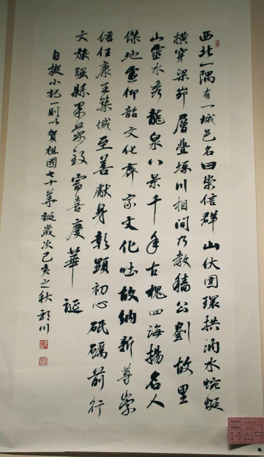 由中共崇信县委宣传部主办,崇信县文体广电和旅游局、崇信县文学艺术界联合会、崇信县融媒体中心、崇信县文化馆、崇信县图书馆、崇信县博物馆、国网甘肃省电力公司平凉供电公司共同承办的“歌颂新时代 铸就新辉煌”崇信县庆祝新中国成立70周年书画作品展在崇信县文化馆顺利开展,共展出作品100余幅, 作品形式新颖,紧跟时代步伐。展出时间将持续到10月底。