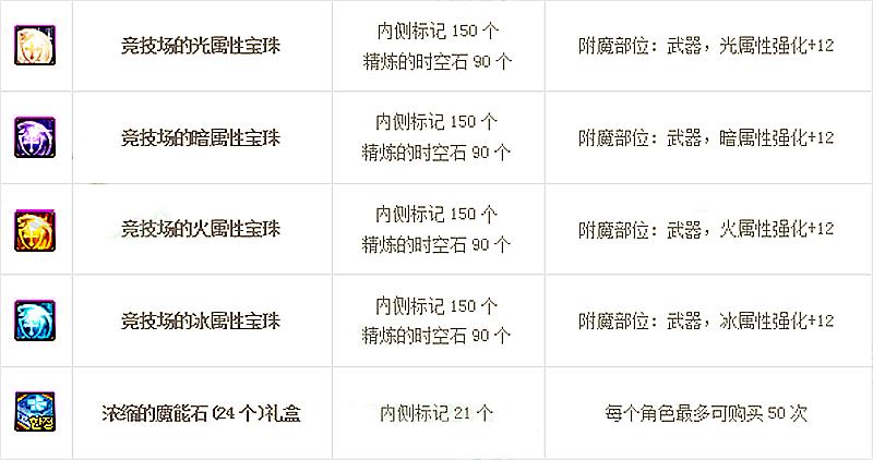 光、暗、火、冰四个属性强化武器部位的附魔宝珠需要150个标记兑换,大概是10天就可以兑换1个,对于小号来说是不错的福利。除了属性强化宝珠外,还有可以使用21个标记兑换浓缩的魔能石礼盒,开启后有24个浓缩的魔能石,每个角色最多兑换50次,也就是1200个浓缩的魔能石,使用标记兑换1200个浓缩的魔能石需要70天。