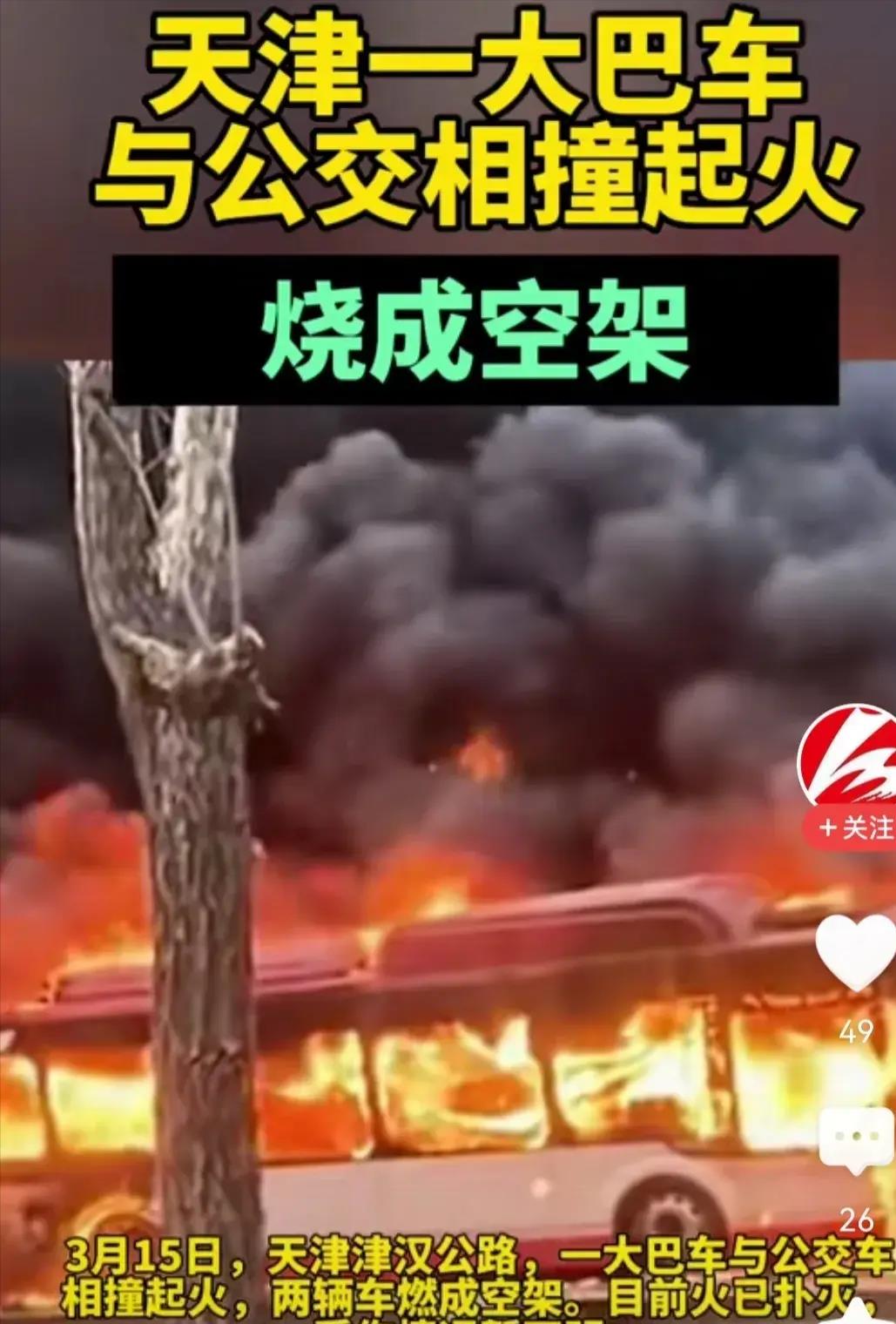 3月15日,天津津汉公路与经三路交口西侧发生一起令人痛心的交通事故。一辆大巴车在行驶过程中,突然追尾了一辆正常行驶的载客公交车,瞬间引发熊熊大火,两车严重损毁,现场一片狼藉。