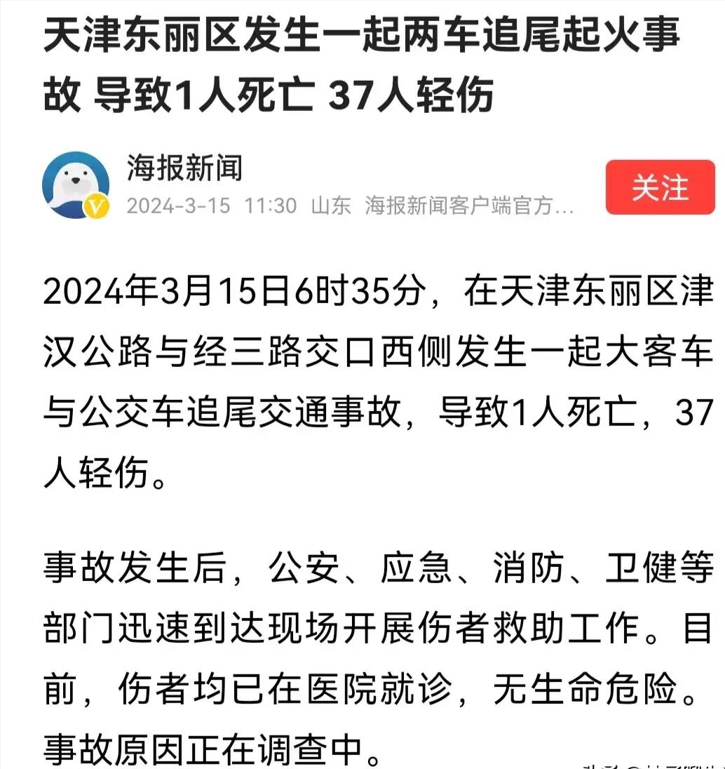 天津大巴追尾公交车酿惨剧:1人死亡37人受伤,安全驾驶警钟长鸣