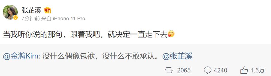 10月24日,金瀚发文承认了和张芷溪的恋情,他发文表示:"没什么偶像包袱,没什么不敢承认",随后张芷溪转发了他这条动态,并公开示爱道:"当我听你说的那句,跟着我吧,就决定一直走下去",让网友大呼甜度爆表。