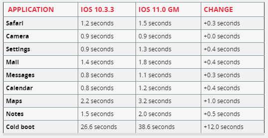 此前曾有海外媒体做了测试,表明iPhone5s使用iOS11后,整体的运行效率会下降,各种应用启动略变慢,从下面的统计对比表可以看出,iPhone5s上同样的应用,iOS11环境下相对iOS10普遍有0.3秒左右的延迟。目前国内iPhone5s用户升级后的反馈,看来是验证了此测试结论。