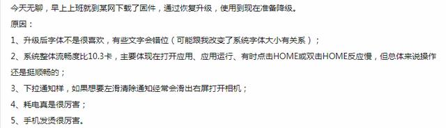 小编综合了下威锋网iPhone5s用户针对iOS11的反馈,目前比较集中的问题就是升级后流畅度降低,有卡顿,同时耗电加剧并且手机发烫明显,多数用户升级后准备降回10.3。其中“lenovo00728”网友归纳整理的内容是当前iPhone5s升级iOS11后普遍遇到的状况: