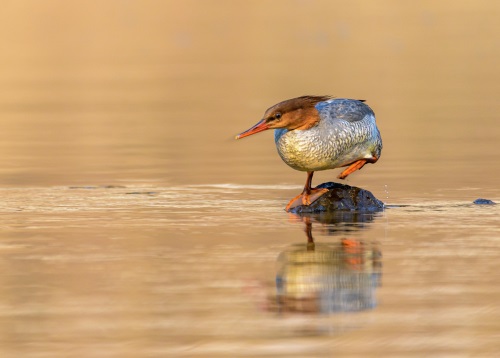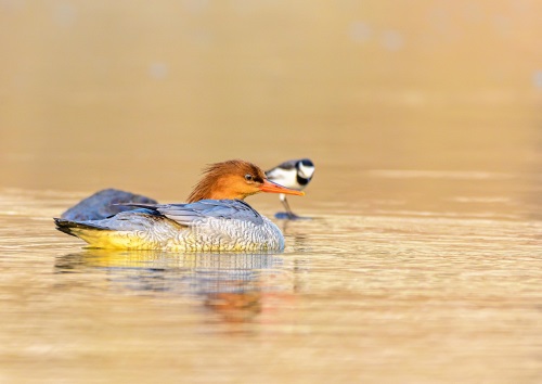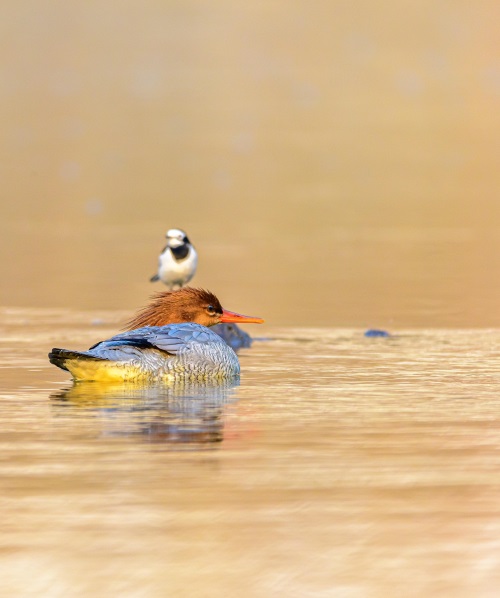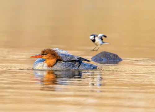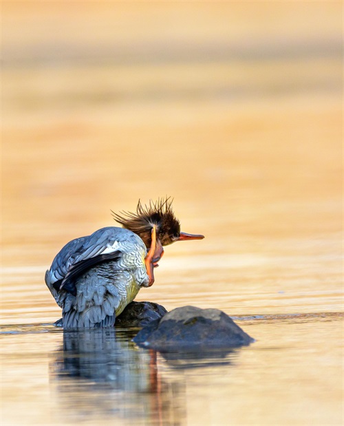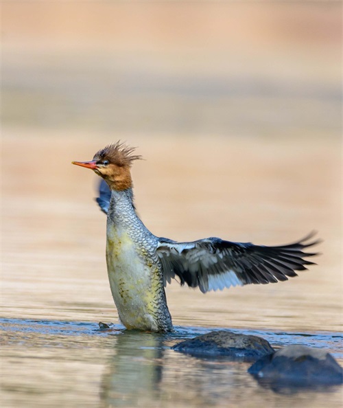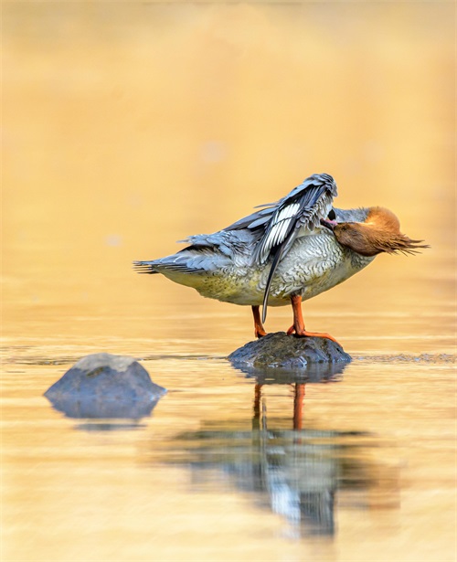2021年12月6日达州州河发现一只中华秋沙鸭雌鸟,一只落单的中华秋沙鸭在达州江湾城州河里独自戏水,非常机警,一边戏水一边不时抬头观看河两岸的情况,有异样就游到河中间,我悄悄躲在河边石头后面用相机拍摄。在一整天的守候中,中华秋沙鸭在水中漂浮梳理后又游到石头上,在暖暖的阳光下,梳理着自己的羽毛,一会儿背上,一会儿腹部,又像自己跟自己按摩,不时还喝口水,中华秋沙鸭最喜欢在溪流中冲浪,潜到水中抓鱼,在河边的本地白鹡鸰鸟看到外来客,也很好奇,中华秋沙鸭游到以前是白鹡鸰停留的河中石头上时,白鹡鸰观察一会儿后,就飞过去赶中华秋沙鸭,占了她的地方,中华秋沙鸭个大也只能灰溜溜的走,这正是“强龙压不过地头蛇”鸭。