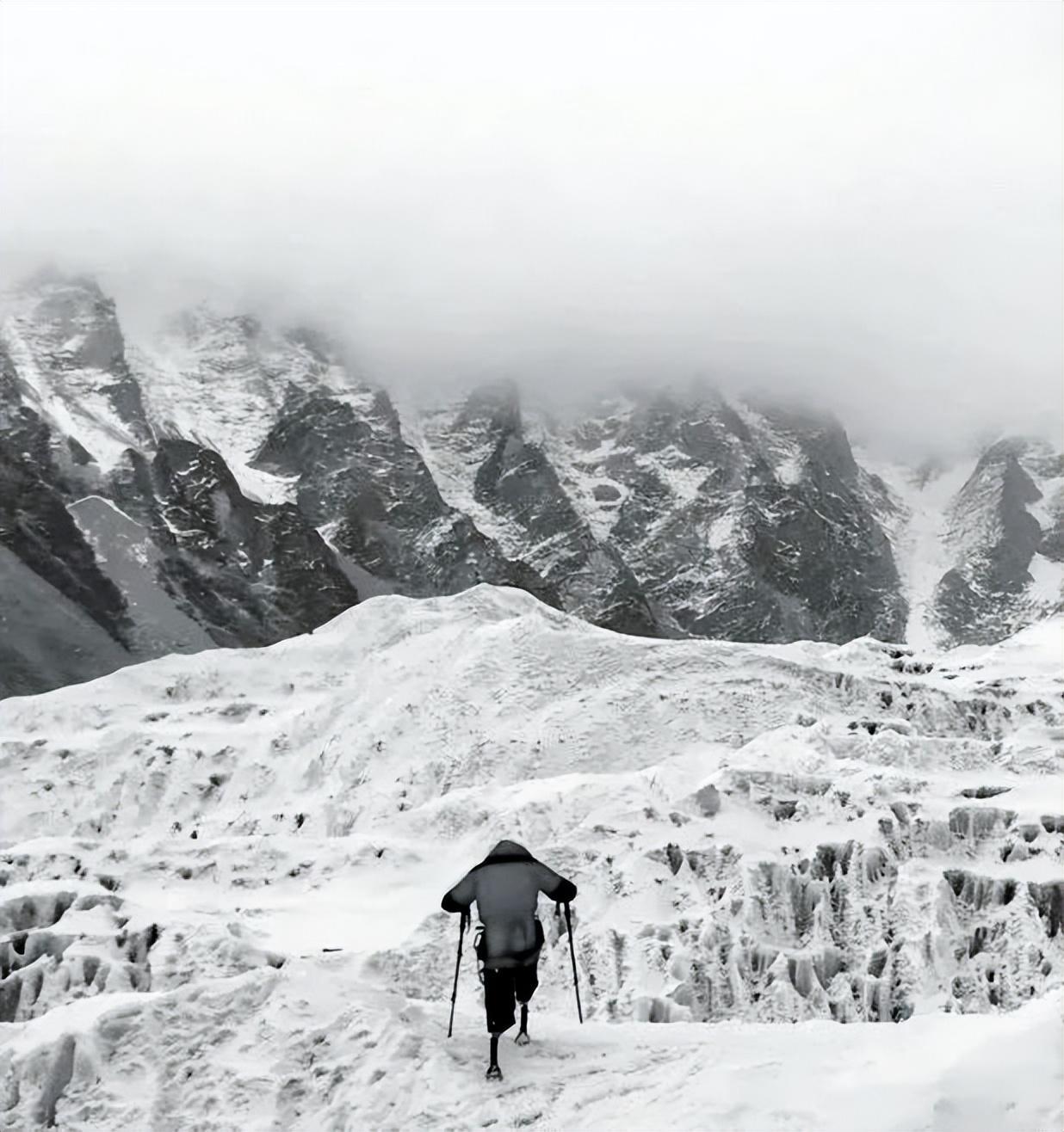 下山途中的暴风雪比2016年导致他无法登顶的那次还猛烈,他冻伤了3根手指。更严重的是持续高强度运动让他的小腿严重肿胀,穿不进假肢,只能忍着剧痛往里硬塞,小腿卡在假肢内壁中,末端处于悬空状态,行动极为不便。下撤到7900米时,他一个踉跄踩到冰裂缝里,腿连着穿戴不稳的假肢直接陷了进去。这时候一发力,“万一掉下去我就全完了”。他大声呼救,夏尔巴向导赶过来用工具把冰裂缝挖宽,然后抓住他的假肢,小心翼翼地将他的腿拔出来。这样的惊险,他遇见了两次。“几次我都想自己可能下不去了,最后已经疼得无法行走,只能一步步往前挪。”