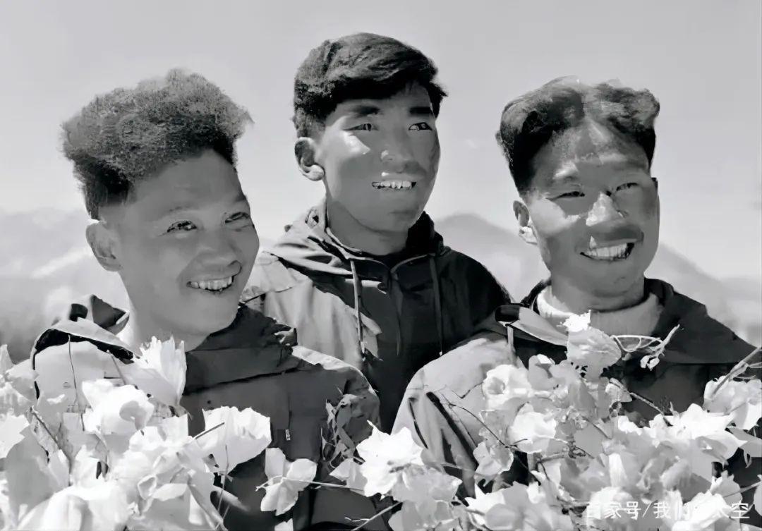 1960年6月7日,人类历史上首次从北坡登顶珠峰的中国登山队队员王富洲(右)、贡布(中)与屈银华三人凯旋拉萨后捧花合影