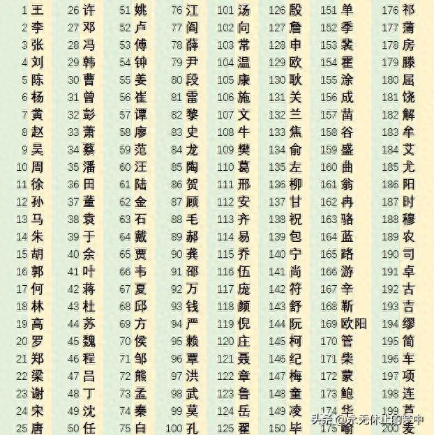 一、最新百家姓排名,前200姓氏: