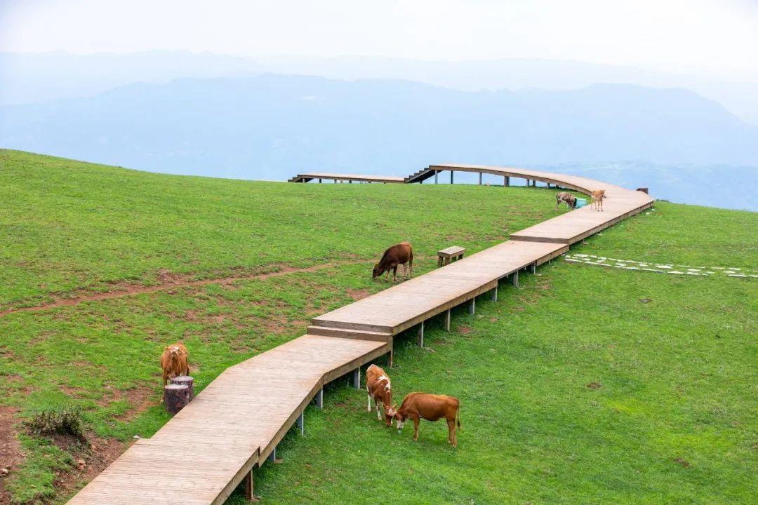 它位于海拔2857米的乌蒙山上,属于空中草甸,连绵起伏,野草丰盛,许多牛羊在这里悠闲地吃着草,游客在这里撒欢的玩耍、拍照。这里年均气温在11℃左右,特别是炎炎夏日,凉风习习,闲适舒爽,是知名的避暑胜地。