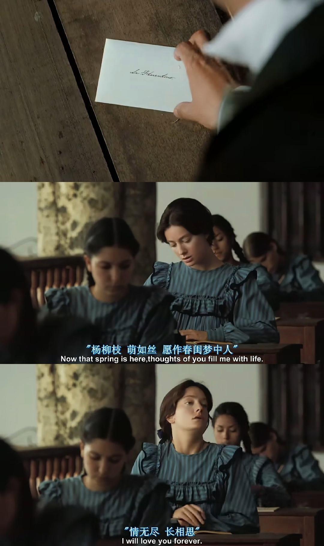 15、那个时期,她的空闲时间都是在“代笔人门廊”度过的,帮助大字不识的恋人们书写香飘四溢的情书,以此释放内心积聚的那些在海关报告中毫无用武之地的绵绵情话。