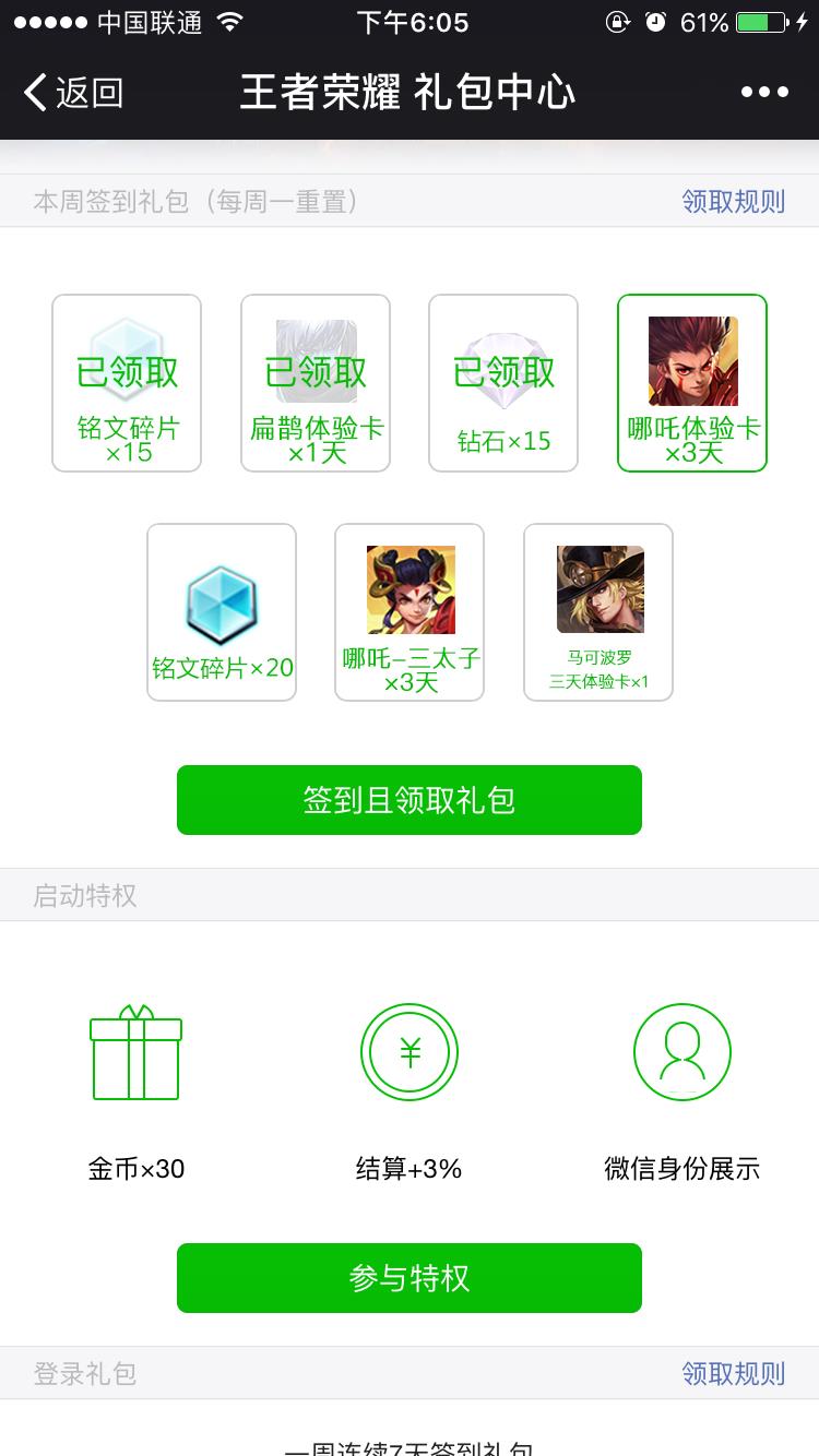 这是微信区的一大特权,不得不说微信区要比QQ区福利要更高一些,玩家可以通过登陆微信,点击发现-游戏中心进入王者荣耀的礼包中心,礼包中心不仅有签到奖励、等级奖励、排位、匹配奖励等一些奖励,在微信中还会享受3%的金币加成,所以玩家在玩游戏的是时候记得从微信中登陆!