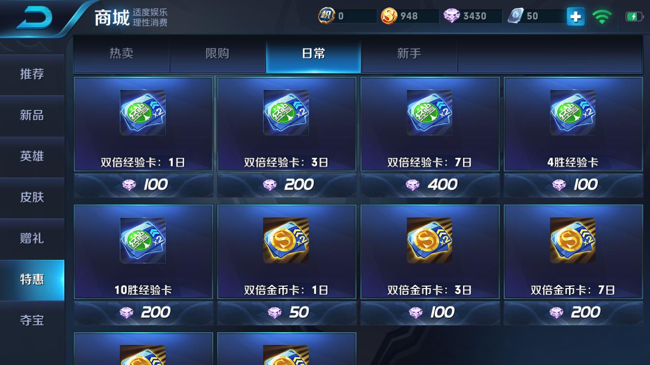 玩家们可以依次点击商城-特惠-日常选项(顶部位置)就可以看到售卖的双倍金币卡和经验卡拉!一共三级页面,确实被许多玩家漏掉了。